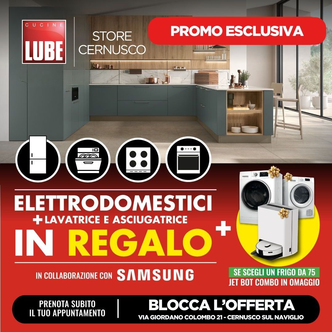 Solo nello store LUBE di Cernusco sul Naviglio se acquisti una cucina, per te 5 promozioni uniche in collaborazione con SAMSUNG + trasporto e montaggio gratuiti.